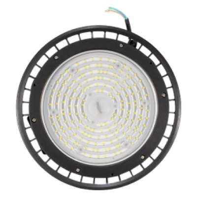 Luminaria LED tipo UFO para interiores, con potencias de 100 a 200W y una eficiencia de 160 lm/W. Luz neutra de 5500K, protección IP65 e IK08, y vida útil de 30.000 h. Ideal para espacios industriales. Garantía de 3 años.